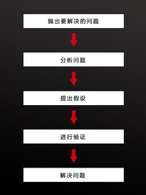 抛出要解决的问题—分析问题—提出假设—进行验证—解决问题。